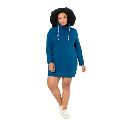Ulla Popken Women's Sweat Dress, Stand Up Collar, Long Sleeve, Pocket Blue Green, 24 26