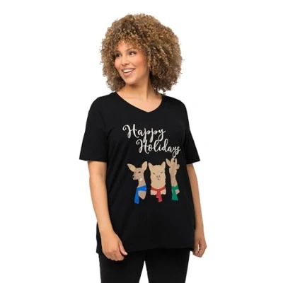 Ulla Popken Women's T Shirt, V Neck, Christmas Animals, Black, 16 18