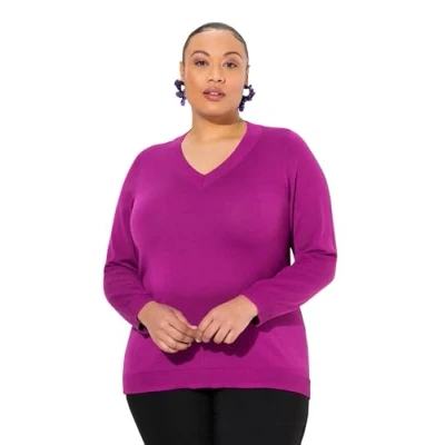 Ulla Popken Women's V Neck, Long Sleeve, Soft Fine Knit Jumper, Berry, 28 UK/30 UK