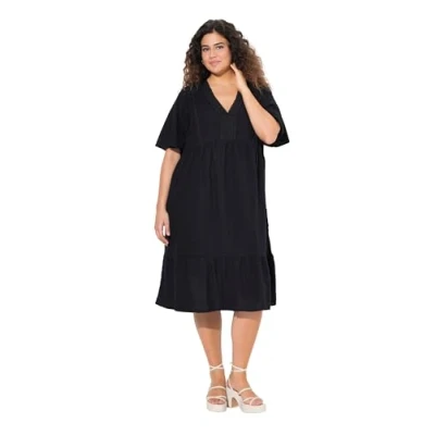 Ulla Popken Women's Volant Kleid mit V Ausschnitt Neck Flounce Dress, Black, 32/34