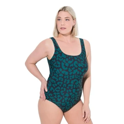 Ulla Popken Women's Badeanzug, Leomuster, Ohne Softcups, Rundhals One Piece Swimsuit, Dark Green, 50 52