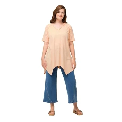 Ulla Popken Womenswear Plus Size Curvy Oversize Eco Cotton Pointed Hem V-Neck Tee Bright Peach 46+ 824705646-46+