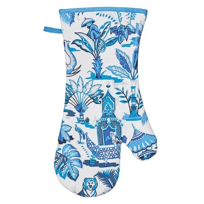 This Ulster Weavers India Blue Gauntlet will protect your hands from hot plates and trays as well as adding character to the kitchen. The ornate design of India Blue is inspired by the indian jungle. Using inspiration from willows, elephants, tigers and monkeys in range of blues enjoying the ancient temple surroundings.Made from 100% cotton with poly wadding filling for protection and meets British Standard (BS6526).