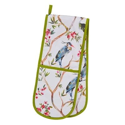 The Ulster Weavers Oriental Birds double oven glove features a design of cranes and oriental birds sitting amongst the blossom in fruit trees.The Ulster Weavers Oriental Birds double oven glove is perfect for protecting hands from hot pots and pans and handling hot plates when serving.Made from 100% Cotton with polyester wadding and machine washable for convenience.