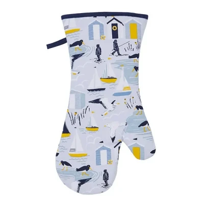 Fishermen are silhouetted against the rising sun after the morning catch, oyster catchers paddle in the shallows, gulls swoop low and water laps gently at the shoreline in this relaxing, seaside inspired collection. Traditional lino cut and block print techniques were explored when creating this design, with the ripples of the water and cloud formations bringing life and movement to counteract the static beach huts. This collection inspires new narratives around the shore with its streamlined shapes in a nautical colour palette. 1 x Gauntlet Oven Glove (37 x 20 x 2cm) Primary Material - 100% Cotton Experience the Ulster Weavers cotton oven gauntlet, where artisanal mastery meets culinary protection. Wrapped in 100% cotton, it showcases our commitment to quality and durability. The thick protective wadding embraces your hand, guarding it from the heat with unrivalled expertise. Discover the meticulous attention to detail in the contrasting piping, a subtle touch that reflects our passion for craftsmanship. With a handy hanging loop, this gauntlet can be proudly displayed and easily accessed whenever your culinary adventures call. Machine washable 40°C, synthetic cycle. Do not bleach. Do not tumble dry. Iron on medium setting. Do not dry clean. Wash similar colours together.