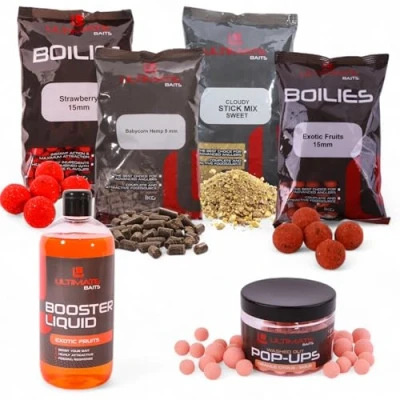 Amazon1x Ultimate Baits Exotic Fruits 15mm 1kg 1x Ultimate Baits Strawberry 15mm 1kg 1x Ultimate Baits Babycorn Hemp 8mm 1kg 1x Ultimate Baits Cloudy Stick Mix Sweet 900g 1x Ultimate Baits Washed Out Pop Ups Orange Citrus & Orange 12+15mm 50g