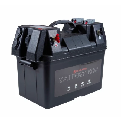 Ultimate Battery Box - Protective box for battery - Dimensions: 33.5 × 19.5 × 20.2cm - Material: high quality plastic - 2x 30A (input/output) heavy duty connectors - 2x 10A output 12V lighter plug - 2x USB port, 2.4A and 2.4 out with LED lighting - Voltmeter with on/off switch and LED display - Equipped with sturdy carrying handle - Charging via solar panel possible - Permanent protection of your battery - Protects against moisture, dust and dirt - Includes strap to secure the box in a boat - Minimizes the chance of failure due to dirt or corrosion Ultimate’s portable Battery Box is suitable as permanent protection for your battery. Among other things, this battery box protects the battery from penetrating moisture, dust and dirt. This ensures that the chance of failure due to dirt or corrosion is very small and the life of the battery is significantly extended. You do not need to open the battery box once the cables are connected. Thus, the battery is completely sealed and therefore resistant to all weather conditions. The battery box features two 12V lighter plugs and two USB ports so you can connect a cooler, phone or navigation equipment to the battery box. With the included strap and brackets you can secure and fix the box to the bottom of your boat.