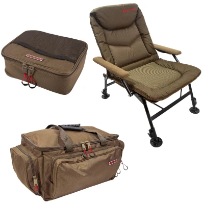 Handy Ultimate fishing chair and luggage set, ideal for mobile anglers! Set includes: - Ultimate Compact Armchair - Ultimate Adventure Compact Carry All - Ultimate Adventure Accessory Case The Ultimate fishing chair and luggage set is perfect for mobile anglers who like to travel light and efficient. This set includes the Ultimate Compact Armchair, a comfortable and sturdy chair, the Ultimate Adventure Compact Carry All for safe storage of all your fishing gear, and the Ultimate Adventure Accessory Case for smaller accessories. With its compact and practical design, this set is ideal for short or long fishing sessions where mobility and convenience are paramount! Specifications: Ultimate Compact Armchair - Compact fishing chair - Dimensions: 44×52×91-101cm - Weight: 5kg - Maximum load: 120kg - Seat height: 30-40cm - Thick foam padding - Extra large mud feet - Height adjustable front legs - Fleece armrest covers - Coated steel frame - Foldable design - Compact and easy to transport Ultimate Adventure Carryall - Material: 600D Oxford Nylon - Dimensions model Compact (lxwxh): 50×30×29cm - Water- and dirt-resistant PVC inner lining - Spacious exterior front pocket - Equipped with several spacious side pockets - Heavy duty zippers equipped with zipper loops - Extra strong handles - Reinforced barrow handles - High quality finish with the best materials - Waterproof - Indispensable for safely transporting and storing your angling equipment! Ultimate Adventure Accessory Case - Compact case for storing accessories - Internal dimensions: 28 × 20 × 8cm - Material: 600D Oxford nylon - Features soft lining with reinforced sturdy inner walls - Mesh pockets on inside lid - Heavy-duty zipper - Oversized zip pulls - High quality finish with best materials - Waterproof - Multiple compartments - Flexible division with Velcro dividers - Ergonomic, sturdy handle made of neoprene - Fits easily into your fishing bag