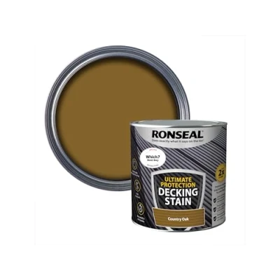 General description Ronseal Ultimate Protection Decking Stain in Country Oak is designed to protect your deck from weather and everyday wear and tear. This high-quality stain not only enhances the appearance of your decking but also provides added slip resistance, ensuring safety throughout the year. It lasts twice as long as standard decking stains, making it a durable choice for outdoor surfaces. Technical specifications Colour: Country Oak Size: 2.5 litres Coverage: 6.4 m² per litre Number of coats required: 2 Application method: Brush or Pad Rainproof in 90 minutes Other information