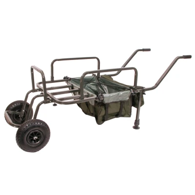 Ultimate Dual Cargo Barrow - Barrow / Transport cart - Weight: 12kg - Dimensions (lxwxh): 160 × 66 × 66cm - Transport size: 91 × 67 × 19cm - Made of robust and high quality steel - Maximum load capacity: 120kg - Front and side bars are foldable - Equipped with two profiled wheels - Ergonomic handles - Mud feet prevent sinking - Equipped with a spacious center bag for heavy items - Extra bag for lighter items - Sturdy but light frame - Removable wheels - Extra space in front of the barrow - Stable and solid - Easy to steer and push - Quickly ready for use - Comes with two straps - Perfect for getting all your gear to your swim in one trip! Sturdy, super strong and extremely spacious. The Ultimate Cargo Dual Barrow meets all requirements for longer sessions and offers plenty of space and storage options. The front and side bars are foldable. The two wheels have sufficient tread for tough terrain and the legs have mud feet to prevent sinking in the mud. The height-adjustable rear legs add stability and are also foldable. The sturdy but lightweight frame features a spacious bag that is easy to attach and remove with clips. Ideal for transporting heavy gear! In addition, the barrow is equipped with a spacious extra bag for less heavy items and extra space in front of the barrow. The whole unit weighs only 12 kg and can be easily stored, thanks in part to the removable wheels.