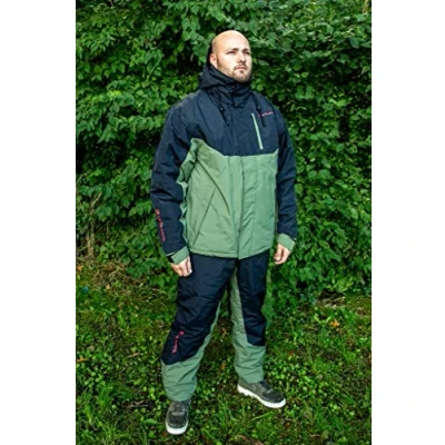 Ultimate Explora Thermo Suit - Thermal suit - Two pieces - Available in multiple sizes - Colour: black/green - Material: nylon with PVC coating - 10.000mm waterproof - Fully water- and windproof - Comfortable fit - Suitable for fishing in the coldest conditions! Jacket features: - Lining: thermal Hollofil fleece - Removable, contoured hood - Velcro Storm Cuffs - Adjustable around waist - Spacious, warm pockets, inside and out - High, fleece-lined collar Features Bib & Brace: - Lining pants: 190T Taffeta - Adjustable suspenders - Wind and waterproof zipper - Reinforced knee and seat area - Warm, fleece-lined pockets - Stormproof zipper covers Please note that this suit is quite roomy. We recommend ordering one size smaller than you are used to. Our model is 1.85m, weighs 85kg and wears the size M. This Explora Thermo Suit from Ultimate is a comfortable thermal suit that will keep you warm on the coldest winter days. The special hollofil thermal lining retains body heat extremely well, while you continue to take full advantage of the freedom of movement the suit has to offer. Moreover, the suit is completely water- and windproof thanks to the taped seams. The two-piece suit consists of a 3/4 jacket – equipped with a removable hood and a fleece-lined, high collar – and bib & brace pants equipped with adjustable suspenders and zippers at the pants’ legs. Both the jacket and pants are amply equipped with warm, lockable interior and exterior pockets and are reinforced against wear at key stress points such as seat and knees. All in all, a great high quality thermal suit guaranteed to keep you warm during the coldest winter fishing sessions! The Explora heat suits are available in multiple sizes. Please note that this suit is quite roomy. We recommend ordering one size smaller than you are used to. Our model is 1.85m, weighs 85kg and wears size M.