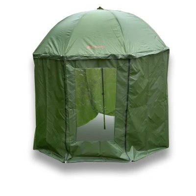 Ultimate Full Screen Umbrella - Color: green - Material: 210D Oxford - Steel leg - Very stable - 100% waterproof - Removable side screen - Equipped with door with window - Equipped with tilt mechanism - Perfectly adjustable against sun and wind - 2-part leg, infinitely adjustable in height - With the sharp point firmly into the ground - Includes guy ropes, pegs and carrying bag This Ultimate Full Screen umbrella provides both protection from the sun in summer and from rain on an autumnal day. Made of polyester material and water- and windproof with taped seams. The zippered side walls feature a windowed “door” which provides even more protection. The umbrella comes with pegs and guy lines so that it can be securely placed and the whole thing is packed in a handy carrying bag.