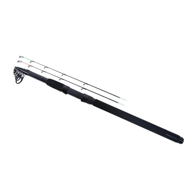 Ultimate Tele Feeder - Telescopic feeder rod - Weight: 296g - Length: 3,30m - Number of sections: 7 (telescopic) - Transport length: 73cm - Casting weight: up to 100g - Includes two tips: 2oz and 3oz - EVA hand piece - Easy to transport - Built with a light and strong blank - Smooth action and even bending curve - Great for taking on vacation - Comes with sturdy transport case The Ultimate Tele Feeder rod is built with a light and strong blank and high-quality components. With its length of 3.30 meters and a casting weight of up to 100g, the rod is suitable for fishing large waters and rivers. Despite the sections, the blank has a smooth action and an even bending curve. The short transport length makes this rod easy to transport and very suitable to take with you on vacation. The rod comes with 2 different top sections.