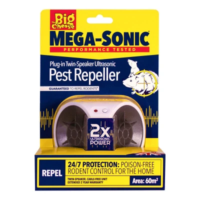 Big Cheese Mega Sonic Pest Repeller uses twin-speaker ultrasonic technology to repel rats and mice from up to 60m² of living spaces or outbuildings, providing a powerful plug-in solution for both current infestations and ongoing rodent prevention—no chemicals or batteries required.