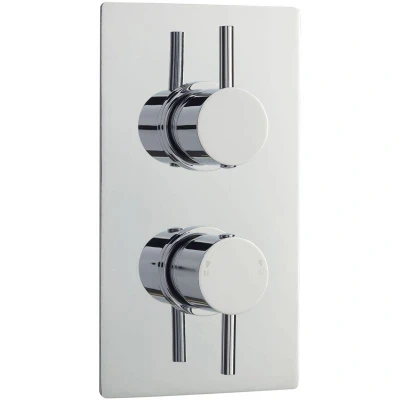 Features and Benefits: Shower valve supplies water to 2 outlets Can be fitted vertically or horizontally Minimalist sleek design Accurate flow control Thermostatic control to +/- 2 degrees even if the water pressure fluctuates Full thermal protection to prevent scalding in the event of hot or cold water shut off Twin handle valve with diverter In the event of hot or cold water failure the valve will shut down as per the relevant standard The unique cartridge is highly resistant to calcium build up - even in hard water areas Our valves are suitable for medium pressure water systems Excellent flow rates - even at low pressure The cartridge is fully reversible meaning if hot and cold supplies are the wrong way round it doesn't need re-plumbing Simply remove the cartridge turn 180C and replace Manufactured from high quality brass & ABS Guarantee : 5 Year (12 months on serviceable moving parts from the date of purchase), please see manufacturer guarantee policy for more information Valve