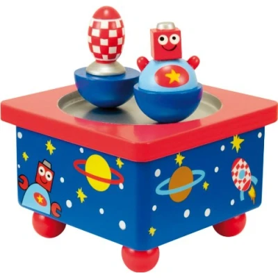 Sure to be a quick and perminant favourite with any little one The Ideal Gift A well made and classic wooden toy This unique music box has a wonderful blue space and rocket design with a ship and robot to dance on the top Wind up and watch you robot dance to the tune of When you wish upon a star