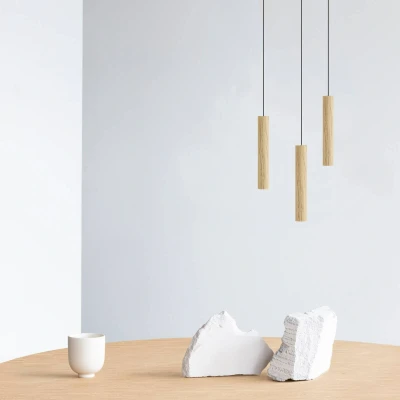 The Chimes Cluster 3 Pendant Light Oak is designed with inspiration from the calm and Nordic atmosphere you find on a quiet walk in the forest. The solid oak is combined with an LED spotlight that provides a warm downward light over the dining or work table.