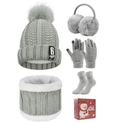 Consisting of 1 Piece Winter Loop Scarf + 1 Piece Knitted Hat+1 Piece Plush EarMuffs +1 Pair Gloves+1 Pair Thick Socks.They are warm, soft, and do not itch!Fashion, generous, cute winter set are suitable for all clothes in winter. Convenient gloves: with touch screen fingers on the thumb, index and middle finger, this warm gloves can ensure that you can use the electronic devices without taking off the gloves, protecting your hands in cold weather.It has a good elastic, and looks STYLISH and CUTE, very SOFT and incredibly COMFORTABLE to wear. OCCASIONS:Great choice to keep warm: a complete set of winter outfits accessories to keep you warm and comfy in the cold winter, save your time and energy to look for them separately, Perfect for outdoor and winter activities such as hiking, cycling, skiing, sledding, snowboarding and ice skating.warm gloves women ear muffs women winter gloves for women ONE SIZE: The stretchy material provides a perfect fit for both women and girls over the age of 8.Christmas Gifts for Girls Ladies:Great for Most Occasions,such as skiing, running, skating, hiking, camping or hunting. Also, it is a good choice as a Christmas Gift, Birthday gift, Thanksgiving Day Gift, New Year Gift and so on. All-match accessories: Simple and classic knitting style, match well with sweaters, cardigans, coat and many different outfits, not only keep you toasty, but also make you nice and trendy. The color of touch screen gloves, scarf and winter hat match very well, so you do not need to waste time to purchase them separately.