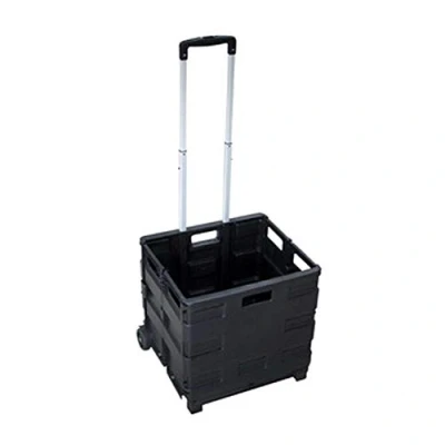 The aluminium and plastic construction of this folding wheeled crate makes it lightweight enough for easy manoeuvring and durable enough for frequent use Maximum load capacity is 35kg Ideal for travel and more Push-button telescopic handle Lightweight and durable