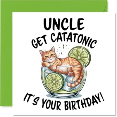 MAKE YOUR UNCLE SMILE WITH THIS UNIQUE BIRTHDAY CARD: This exceptional quality Uncle birthday card shows the design ''Uncle Get Catatonic Its your Birthday''. If you are looking for an awesome birthday card for Uncle, then then this happy birthday Uncle card is bound to make them smile. Not just a birthday card for Uncle this could also be a birthday gifts for Uncle, Step Uncle or Uncle in Law. WHAT DO YOU GET: The card is printed on one side and BLANK ON THE INSIDE to allow you to write your very own message. The unique fun design is printed on a specially sourced and environmentally responsible board. At 360 microns thick the natural white one-sided gloss board has a quality look and feel. Supplied with a coloured gummed envelope to complement the design and ready to be sealed and sent in the post. Great Uncle birthday cards, Step Uncle birthday card. NO INK SMUDGES: There is nothing worse than writing inside a card to find that the shiny surface makes the ink smudge. This is why we use a high quality one sided coated board. The uncoated side will absorb more of the ink from your pen to make smudging a thing of the past. Uncle birthday cards, Uncle birthday cards from Nephew. SIZES: Greeting Card = 145mm x 145mm, Envelope = 155mm x 155mm, Card Thickness = 360 micron. Happy birthday Uncle, Uncles birthday card, Uncle cards birthday, birthday card Uncle, happy birthday Uncle card, Uncle gifts from Nephew. MADE AND QUALITY CHECKED IN THE UK: We print and manufacture all our products right here in the UK so you can be sure of a fast turnaround and a product that is expertly made. Using environmentally responsible premium board our card is conscious of the responsible management of the world''s forests - happy birthday card Uncle, Uncle birthday cards.