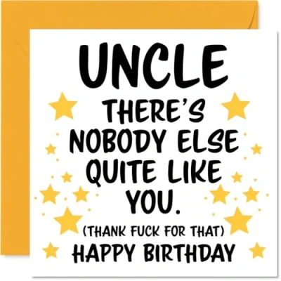 MAKE YOUR UNCLE SMILE WITH THIS UNIQUE BIRTHDAY CARD: This exceptional quality Uncle birthday card shows the design 'Uncle Theres nobody else quite like you. (Thank fuck for that) Happy Birthday'. If you are looking for an awesome birthday card for Uncle, then then this happy birthday Uncle card is bound to make them smile. Not just a birthday card for Uncle this could also be a birthday gifts for Uncle, Step Uncle or Uncle in Law. WHAT DO YOU GET: The card is printed on one side and BLANK ON THE INSIDE to allow you to write your very own message. The unique fun design is printed on a specially sourced and environmentally responsible board. At 360 microns thick the natural white one-sided gloss board has a quality look and feel. Supplied with a coloured gummed envelope to complement the design and ready to be sealed and sent in the post. Great Uncle birthday cards, Step Uncle birthday card. NO INK SMUDGES: There is nothing worse than writing inside a card to find that the shiny surface makes the ink smudge. This is why we use a high quality one sided coated board. The uncoated side will absorb more of the ink from your pen to make smudging a thing of the past. Uncle birthday cards, Uncle birthday cards from Nephew. SIZES: Greeting Card = 145mm x 145mm, Envelope = 155mm x 155mm, Card Thickness = 360 micron. Happy birthday Uncle, Uncles birthday card, Uncle cards birthday, birthday card Uncle, happy birthday Uncle card, Uncle gifts from Nephew. MADE AND QUALITY CHECKED IN THE UK: We print and manufacture all our products right here in the UK so you can be sure of a fast turnaround and a product that is expertly made. Using environmentally responsible premium board our card is conscious of the responsible management of the world's forests - happy birthday card Uncle, Uncle birthday cards.