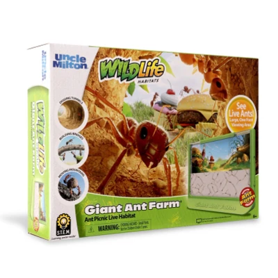 The Uncle Milton Giant Ant Farm features a redesigned, double-sized viewing area with a fun picnic scene, tubes for expansion, and a durable build—making it an excellent educational tool for children aged 6+ to observe and learn about ant colony behavior at home or in the classroom.