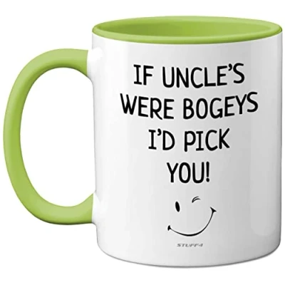 MAKE YOUR UNCLE GIGGLE: If you are looking for special keepsake gifts for yoru Uncle then look no further. This exceptional quality mug bears the wording – If Uncle's Were Bogeys, I'd Pick You – Uncle presents to make them smile. Not just for his Birthday, Christmas or Fathers Day but this mug could be given to them just because they are so great. WHAT DO YOU GET: This funny Uncle present is made from the highest quality mugs available on the market. An 11oz ceramic gloss finished mug with a large handle for ease of use. The great birthday gifts for Uncle design is printed on both sides so no one will miss it. Incredibly funny and well-made gift for your Uncles from Stuff4 Ltd. PACKAGED FOR PROTECTION: Every order is packed in a drop proof Mug Mailer which are lightweight, flexible, and strong enough to provide total protection. So have your Uncle in pieces and not the novelty funny mug. MADE AND QUALITY CHECKED IN THE UK: We print all our product right here in the UK so you can be sure of a fast turnaround and a product that is expertly made - Uncle Birthday gifts that are quality and hard wearing. 11oz DISHWASHER AND MICROWAVE SAFE MUGS: Made from premium ceramic our 11oz heavyweight mugs are manufactured with a dishwasher safe premium coating. This means that the colours of your image will not fade even after multiple cycles (up to 800) through a dishwasher. They are also microwave safe.