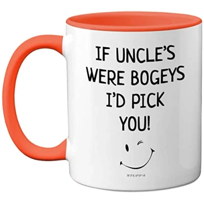 MAKE YOUR UNCLE GIGGLE: If you are looking for special keepsake gifts for yoru Uncle then look no further. This exceptional quality mug bears the wording – If Uncle's Were Bogeys, I'd Pick You – Uncle presents to make them smile. Not just for his Birthday, Christmas or Fathers Day but this mug could be given to them just because they are so great. WHAT DO YOU GET: This funny Uncle present is made from the highest quality mugs available on the market. An 11oz ceramic gloss finished mug with a large handle for ease of use. The great birthday gifts for Uncle design is printed on both sides so no one will miss it. Incredibly funny and well-made gift for your Uncles from Stuff4 Ltd. PACKAGED FOR PROTECTION: Every order is packed in a drop proof Mug Mailer which are lightweight, flexible, and strong enough to provide total protection. So have your Uncle in pieces and not the novelty funny mug. MADE AND QUALITY CHECKED IN THE UK: We print all our product right here in the UK so you can be sure of a fast turnaround and a product that is expertly made - Uncle Birthday gifts that are quality and hard wearing. 11oz DISHWASHER AND MICROWAVE SAFE MUGS: Made from premium ceramic our 11oz heavyweight mugs are manufactured with a dishwasher safe premium coating. This means that the colours of your image will not fade even after multiple cycles (up to 800) through a dishwasher. They are also microwave safe.