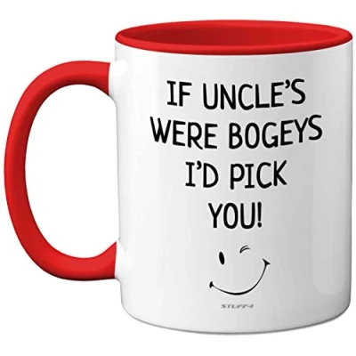 MAKE YOUR UNCLE GIGGLE: If you are looking for special keepsake gifts for yoru Uncle then look no further. This exceptional quality mug bears the wording – If Uncle's Were Bogeys, I'd Pick You – Uncle presents to make them smile. Not just for his Birthday, Christmas or Fathers Day but this mug could be given to them just because they are so great. WHAT DO YOU GET: This funny Uncle present is made from the highest quality mugs available on the market. An 11oz ceramic gloss finished mug with a large handle for ease of use. The great birthday gifts for Uncle design is printed on both sides so no one will miss it. Incredibly funny and well-made gift for your Uncles from Stuff4 Ltd. PACKAGED FOR PROTECTION: Every order is packed in a drop proof Mug Mailer which are lightweight, flexible, and strong enough to provide total protection. So have your Uncle in pieces and not the novelty funny mug. MADE AND QUALITY CHECKED IN THE UK: We print all our product right here in the UK so you can be sure of a fast turnaround and a product that is expertly made - Uncle Birthday gifts that are quality and hard wearing. 11oz DISHWASHER AND MICROWAVE SAFE MUGS: Made from premium ceramic our 11oz heavyweight mugs are manufactured with a dishwasher safe premium coating. This means that the colours of your image will not fade even after multiple cycles (up to 800) through a dishwasher. They are also microwave safe.