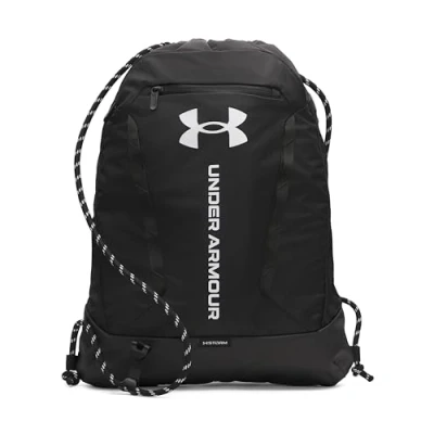 Under Armour Unisex Hustle Sackpack, Water Resistant Rucksack for Sports and Outdoor Pursuits, Essential Bag with Front Pocket,Black/Black/White,OSFM