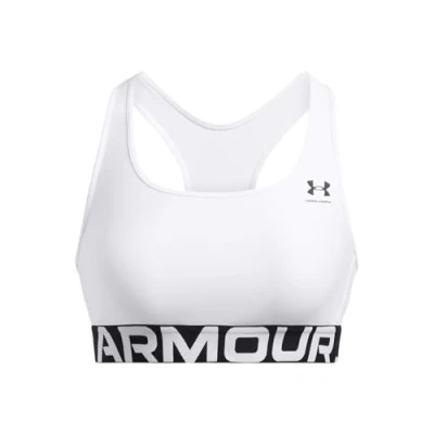 Under Armour Women's Heat Gear Mid Branded, Medium Support Sports Bra with 4 Way Stretch Material, Gym Double Lined Coverage,White / Black,SM