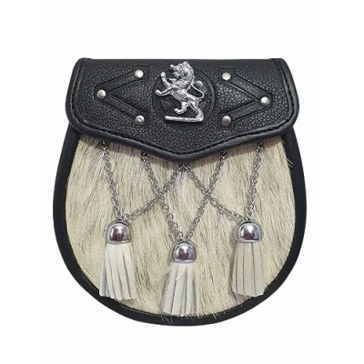 "Elegant Design: This black leather sporran is adorned with a thistle crest and three tassels, making it an ideal accessory for formal occasions and traditional Scottish attire." "Adjustable Chain Belt: The sporran includes an adjustable leather chain belt suitable for waist sizes between 28 and 48 inches, providing a secure and comfortable fit." "Easy Maintenance: Keep this sporran looking its best with a simple dry cloth clean, preserving its timeless beauty." "Versatile and Functional: Perfectly complementing a variety of kilt dress styles, this sporran offers great value for money and features a spacious panel for storing essential items." "Premium Quality and Handmade: Crafted from genuine seal skin with metal chrome chain accents, this sporran is not only elegant but also durable. It's suitable for formal events as well as everyday use, making it a versatile and long-lasting accessory."