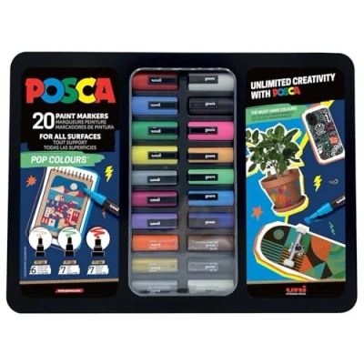 Complete POSCA set: Contains 20 coloured markers with which you can effortlessly design different surfaces Can be used on a variety of surfaces: The ink is permanent on surfaces such as wood, fabric, cardboard, plastic, stone and metal; however, it can be easily erased from smooth materials such as glass, window panes and mirrors Optimal coverage: these paint pens offer optimal colour coverage and are ideal for decorating and customising shoes, textiles and other projects Practical case: the POSCA marker set comes in a sturdy and practical case that keeps your markers safe and allows you to keep them handy at all times Durability and quality: these long-lasting colored markers are suitable for long time use and a consistent, professional result every time