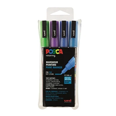 Colour Marker Water Based with Colourfast pigments Suitable for all surfaces including paper, cardboard, wood, clay, metal, textiles, ceramics, porcelain, plastic, etc Colours are blendable, Aquarellierbar and and can be painted over With fine round tip to color, draw, create, and mark writing Set of 4 in glitter light blue glitter Dark Blue Glitter Purple and Glitter Dark Green, Manufacturer: Mitsubishi