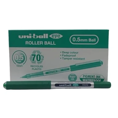 PRECISION WRITING: 0.5mm micro tip delivers crisp, detailed lines great for exams, coursework and professional documents. SMOOTH PERFORMANCE: Uni-flow ink system ensures consistent, skip-free writing with quick-drying, smudge-resistant results. ERGONOMIC DESIGN: Balanced barrel and comfortable grip reduce hand fatigue during extended writing sessions. VERSATILE USE: Ideal for detailed note-taking, diagrams, essays and everyday writing tasks in school, office or home. CONVENIENT PACK: Set of 12 green rollerball pens ensures you always have a reliable writing instrument at hand.