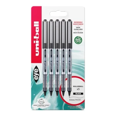 Uni ball UB 150 Eye Black Rollerball Pens. Premium Micro 0.5mm Ballpoint Tip for Super Smooth Handwriting, Drawing, Art, Crafts and Colouring. Fade Water Resistant Liquid Ink. 5 Pack
