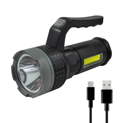 Dual-Function Lighting – Combines a high power 3W LED spotlight (200 lumens) for focused lighting with a superbright 3W COB LED lantern (200 lumens) for wide-area illumination, offering delivering versatile performance in one unit. Multiple Lighting Modes – Spotlight offers high and low beam settings for flexible use, while the lantern offers a simple on/off mode providing bright, steady light, providing adaptable brightness levels to suit a variety of tasks and environments. Rechargeable with Battery Level Indicator – Built-in 3.7V 1200mAh lithium battery recharges in approximately 3.5 hours via the included 30cm Type-C USB cable, delivering up to 7 hours of continuous illumination, with a clear LED battery level indicator to monitor charging and power status. Comfortable Carry Handle – Fitted with an integrated handle for easy carrying, holding and positioning, ensuring portability and convenience wherever the light is required. Compact & Practical Design – Powerful and reliable, this rechargeable spotlight with integrated lantern is designed for everyday use, making it ideal for camping trips, DIY projects, outdoor activities, nighttime walks or adventures, power cuts and emergencies.