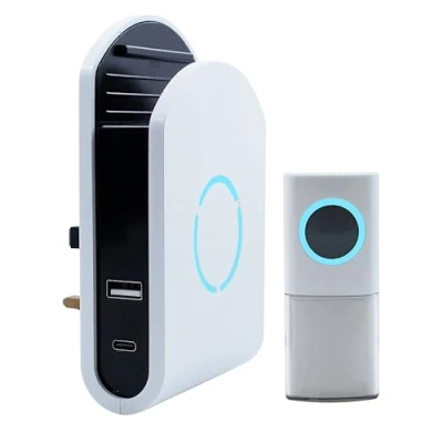 ManoManoGeneral description This wireless door chime features USB-A and USB-C ports along with a convenient shelf to hold your mobile phone while charging. It is suitable for use around the home and plugs into any standard 13A socket. The chime operates wirelessly with an extended range of up to 200 meters, ensuring you won't miss visitors or deliveries. The water-resistant push button (IP44 rated) allows for outdoor installation. Technical specifications Wireless range: up to 200 meters Power supply: Plug into standard 13A socket Push button: Powered by 1 x CR2032 battery (included) Chime melodies: 30 options Sound level: 90dB(A) with volume control Operating modes: Chime only, LED alert only, or both Water resistance: IP44 rated Compatibility and accessories Compatible with all wireless and Uni-Com door chimes Installation Plug the receiver into any standard 13A socket inside your home Mount the water-resistant push button outside your door Configure the operating mode and chime melody as