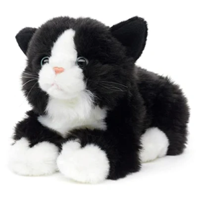 Uni Toys Cat black and white lying down 20 cm (length) plush kitten toy, cuddly toy