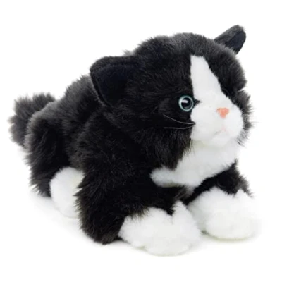 Uni Toys Cat with voice (black white), lying down 20 cm (length) plush kitten toy, cuddly toy