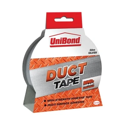 Amazon MarketplaceQuality duct tape for a variety of uses High strength adhesive for a multitude of different surfaces Use for binding, repairing and reinforcing Heavy duty and water resistant Colour: Silver Dimensions: 50mm x 50m, Weight: 0.52 Pounds, Manufacturer: Unibond