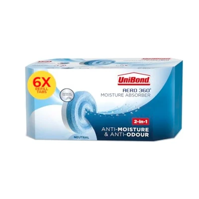 Moisture & Odour control - The AERO 360° moisture absorber and the UniBond AERO 360 refill tabs offer a simple solution to effectively absorb excess moisture and to neutralise bad smells in your home. 2-in-1 - Patented wave-shaped UniBond refill tab to maximise air circulation combined with ultra-absorbing active crystals and patented anti-odour agents to prevent damp problems and musty smells. Long-Lasting - One UniBond AERO 360 moisture absorber refill tab lasts from 1 to 3 months in normal room conditions depending on temperature and humidity. Universal use - The UniBond AERO 360° damp absorber refill tabs easily fit in most humidity absorber devices with a capacity of at least 450g. Package Contents - UniBond AERO 360° Moisture Absorber Neutral Refill Tab, for highly efficient moisture absorption, 6 x 450g Refills for the AERO 360° and most other devices with a capacity of ≥ 450g, Weight: 6.09798616692 Pounds, Manufacturer: Henkel