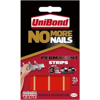 Unibond No More Nails Permanent Strips, Adhesive Strips for Fast & Easy Mounting, Double Sided Sticky Tape Interior Exterior Use, Waterproof Tape, Pack of 10, 1
