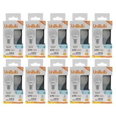 ENERGY EFFICIENCY: 4.2W LED bulb provides 470 lumens of brightness whilst using 90% less energy than traditional 40W incandescent bulbs LIGHT OUTPUT: Daylight white 6500K colour temperature delivers crisp, bright illumination perfect for task lighting and workspaces COMPATIBILITY: E14 small screw base (SES) fits standard E14 sockets operating on 220-240V mains power supply COMPACT DESIGN: P45 golf ball shaped bulb with 4.5 cm diameter provides focused lighting in small fixtures and tight spaces LONG LIFESPAN: These non-dimmable LED bulbs have an estimated 25,000 hours lifetime for long-lasting performance, Weight: 0.03086471668 pounds, Manufacturer: UniBulb