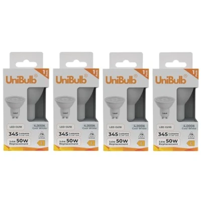 ENERGY EFFICIENT: 3.6W LED spotlight bulb provides 345 lumens of cool white light whilst using 93% less energy than traditional 50W halogen equivalents. These bulbs are Energy Rated E and use 39% less energy than using 5W LED bulbs COOL WHITE: 4000K colour temperature creates a bright and inviting atmosphere perfect for kitchens, living rooms and hallways LONG LIFESPAN: Rated for an impressive 25,000 hours of continuous operation, reducing the frequency of bulb replacements EASY INSTALLATION: Standard GU10 base fitting ensures quick and straightforward replacement of existing spotlight bulbs CONTENTS: Non-dimmable LED GU10 warm white spotlight bulbs perfect for updating ceiling fixtures, Weight: 0.0440924524 Pounds, Manufacturer: UniBulb