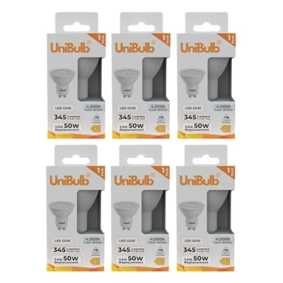 ENERGY EFFICIENT: 3.6W LED spotlight bulb provides 345 lumens of cool white light whilst using 93% less energy than traditional 50W halogen equivalents. These bulbs are Energy Rated E and use 39% less energy than using 5W LED bulbs COOL WHITE: 4000K colour temperature creates a bright and inviting atmosphere perfect for kitchens, living rooms and hallways LONG LIFESPAN: Rated for an impressive 25,000 hours of continuous operation, reducing the frequency of bulb replacements EASY INSTALLATION: Standard GU10 base fitting ensures quick and straightforward replacement of existing spotlight bulbs CONTENTS: Non-dimmable LED GU10 warm white spotlight bulbs perfect for updating ceiling fixtures, Weight: 0.0440924524 Pounds, Manufacturer: UniBulb