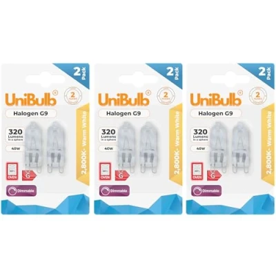 HEAT RESISTANT: Specially designed to withstand extreme temperatures up to 300℃, making it ideal for ovens and microwaves ILLUMINATION: Produces 320 lumens of warm white light at 2800K colour temperature for cosy ambient lighting POWER SPECS: 40-watt G9 base halogen capsule bulb operates efficiently for various household applications LIFESPAN: Reliable 2000-hour operational life ensures long-term performance and value PACKAGE CONTENTS: Choose between 2 and 20 halogen capsule bulbs, perfect for replacement or backup needs, Weight: 0.00661386786 Pounds, Manufacturer: UniBulb