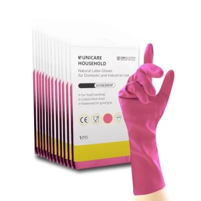 Ambidextrous; available in four colours to comply with the major colour-coding schemes - blue, green, pink and yellow. Tested to safety standards EN420 (protective gloves - general requirements) and EN1186 (food safe) Diamond-textured latex provides superior grip, performance and safety, especially in wet or oily conditions; the beaded cuff offers extra strength during donning and prevents liquid roll back Rubber exterior locks out water and helps protect against detergents and fats. Unicare Household gloves can be used across a range of industries including cleaning, janitorial and food processing Anatomically shaped for a more comfortable fit, with a soft flock lining to help keep hands dry during use, whilst the medium-weight construction provides a balance of strength and sensitivity A soft cotton flock lining helps keep hands feeling cool and dry whilst strong latex ensures durability; Suitable for colour-coding in food, cleaning and healthcare environments