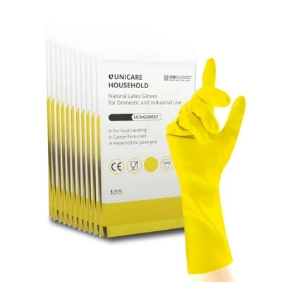 Ambidextrous; available in four colours to comply with the major colour-coding schemes - blue, green, pink and yellow. Tested to safety standards EN420 (protective gloves - general requirements) and EN1186 (food safe) Diamond-textured latex provides superior grip, performance and safety, especially in wet or oily conditions; the beaded cuff offers extra strength during donning and prevents liquid roll back Rubber exterior locks out water and helps protect against detergents and fats. Unicare Household gloves can be used across a range of industries including cleaning, janitorial and food processing Anatomically shaped for a more comfortable fit, with a soft flock lining to help keep hands dry during use, whilst the medium-weight construction provides a balance of strength and sensitivity A soft cotton flock lining helps keep hands feeling cool and dry whilst strong latex ensures durability; Suitable for colour-coding in food, cleaning and healthcare environments