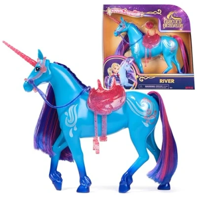 Official 11” River unicorn: Based on the popular NETFLIX show & best-selling kids books, gentle, shy River comes to life with true-to-show details – metallic Water Magic power markings, glittery horn, soft mane & tail Realistic head movement: Move River’s head to make his personality shine. His translucent glittery bridle & saddle doll accessories are removable. Keep River’s mane & tail shiny with the brush Pair with Isabel doll: Experience the magical bond between unicorn & rider with Isabel. Pose her to ride River into adventure, recreating pretend play stories inspired by the show Collect them all: Unicorn Academy unicorns, dolls & accessories (girl toys each sold separately) spark imaginative storytelling. Fun unicorn gifts, birthday gifts & gifts for any occasion Includes: 1 Unicorn, 1 Removable Saddle, 1 Removable Bridle, 1 Hair Styling Tool Bring the adventure home: Expand your Unicorn Academy world with dolls, unicorns, small dolls, stuffed animals, plushies and more. Exciting unicorn toys for girls age 4-6 and up, Manufacturer: Spin Master
